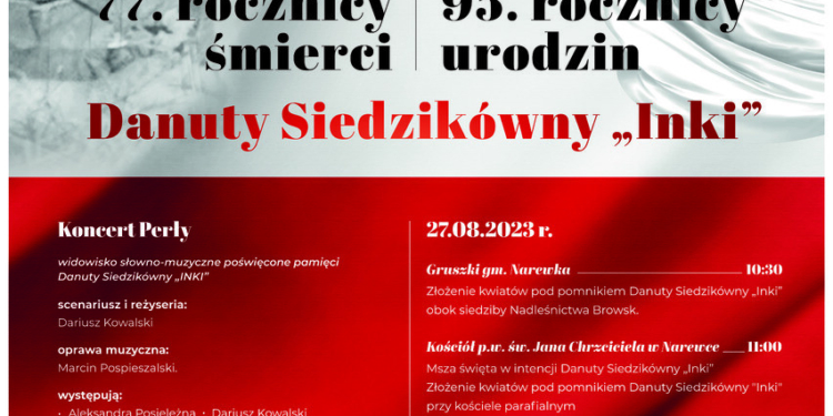 - Gruszki gm. Narewka, godz. 10:30 – złożenie kwiatów pod pomnikiem Danuty Siedzikówny „Inki”.