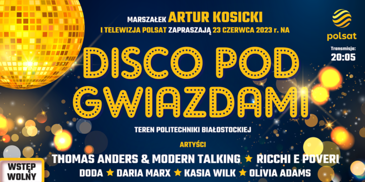 Po przerwie spowodowanej pandemią COVID-19, do Białegostoku powraca kultowy festiwal muzyki dyskotekowej: Disco Pod Gwiazdami! Już 23 czerwca zobaczymy i usłyszymy największe gwiazdy z Polski i zagranicy. Swoimi występami imprezę uświetnią m.in.: Doda, Viki Gabor, Daria Marx, Kasia Wilk, Olivia Adams, ATC, Mikolas Josef, Oskar Cyms, Mezo & Liber, Velvet, Loona, Fun Factory, Skolim, Minelli, Akcent (zespół z Rumunii) i in-ni. Gwiazdą wieczoru będzie Thomas Anders & Modern Talking oraz Ricchi e Poveri. Impreza będzie transmitowana na żywo w Telewizji Polsat.