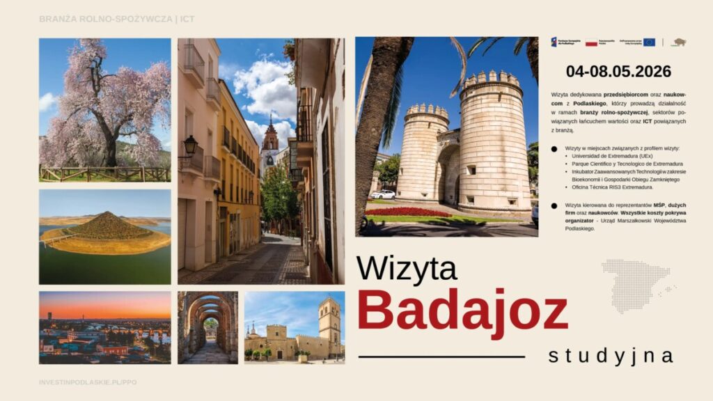 - Badajoz (Hiszpania) – termin wyjazdu 04-08 maja 2026 r. – wizyta adresowana do branży rolno-spożywczej i sektorów z nią powiązanych. Uczestnicy spotkają się z badaczami z Universidad de Extremadura (UEx), zwiedzą technologiczny Parque Cientifico y tecnologico de EWxtramadura, poznają działalność Inkubatora Zaawansowanych Technologii w zakresie Bioekonomii i Gospodarki Obiegu Zamkniętego oraz Oficina técnica de la RIS3 Extremadura, czyli Biuro Regionalnej Strategii Badań Naukowych i Innowacji (RIS3) dla Extramadury, którego celem jest transformacja ekologiczna i cyfrowa regionu.