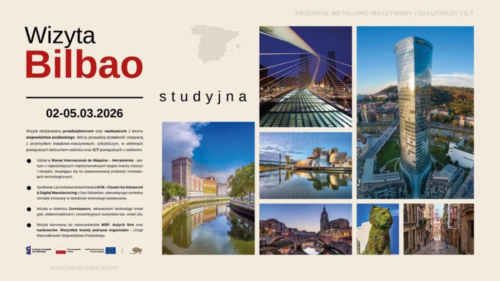 - Bilbao (Hiszpania) – termin wyjazdu 02-05 marca 2026 r. – to propozycja dla przedstawicieli firm i nauki związanych swoją działalnością z przemysłem metalowo-maszynowym, szkutniczym i sektorach powiązanych. Uczestnicy wezmą udział w jednym z najważniejszych wydarzeń międzynarodowych BIEMH-Bienal Internacional de Máquina-Herramienta – skupiającym się na zaawansowanej produkcji maszyn i innowacjach technologicznych. W programie także m.in.: spotkanie w klastrze AFM – Cluster for Advanced & Digital Manufacturing w San Sebastian oraz w zrewitalizowanej dzielnicy Bilbao – Zorrotzaurre – która staje się laboratorium technologii smart grid, elektromobilności i zeroemisyjnych budynków.
