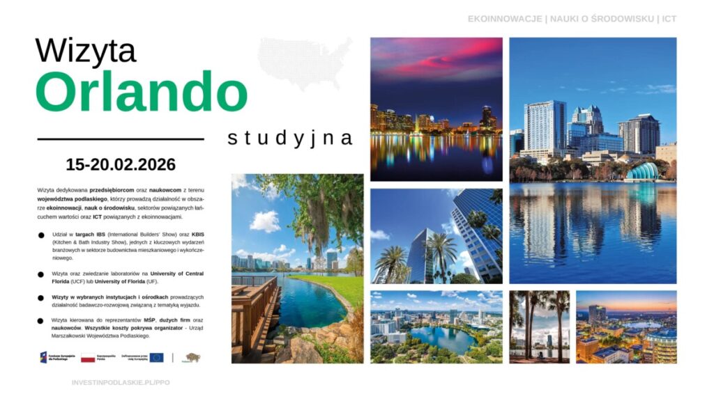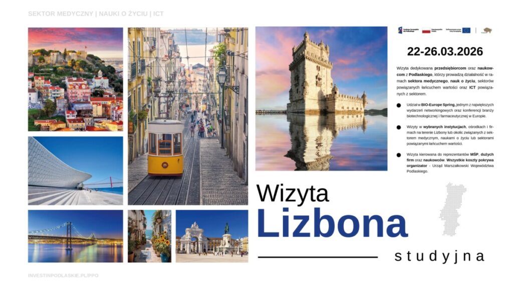 Międzynarodowe targi i konferencje, spotkania w specjalistycznych laboratoriach, instytucjach badawczych, uczelniach i inkubatorach, gdzie biznes łączy się z nauką – to ogólny program wizyt studyjnych w 2026 r. skierowanych do podlaskich przedsiębiorców i naukowców. Zaplanowane są wyjazdy do Orlando (USA), Lizbony (Portugalia), Bilbao i Badajoz (Hiszpania).