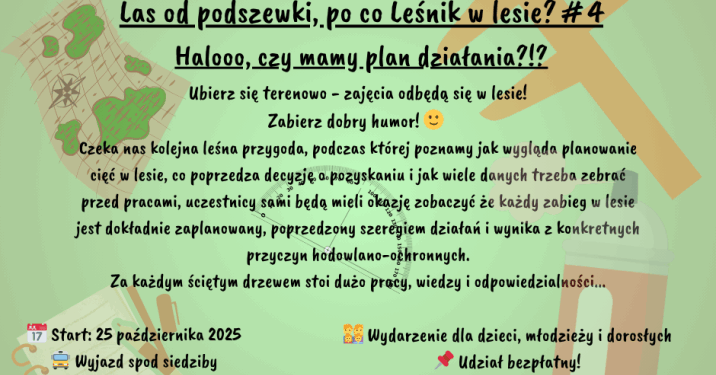 Celem spotkania będzie pokazanie, że każde działanie w lesie – a szczególnie cięcia – jest poprzedzone wieloma czynnościami planistycznymi, opartymi na danych terenowych, inwentaryzacjach, analizach przyrodniczych i dokumentacji.
