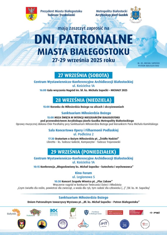 Białystok po raz dziesiąty będzie obchodził Dni Patronalne Miasta – w tym roku w dniach 27-29 września. W programie znalazły się uroczysta msza święta w intencji mieszkańców, konferencja naukowa, koncerty, a także gala wręczenia nagród „Michały 2025”. Dni patronalne poświęcone są błogosławionemu księdzu Michałowi Sopoćce.