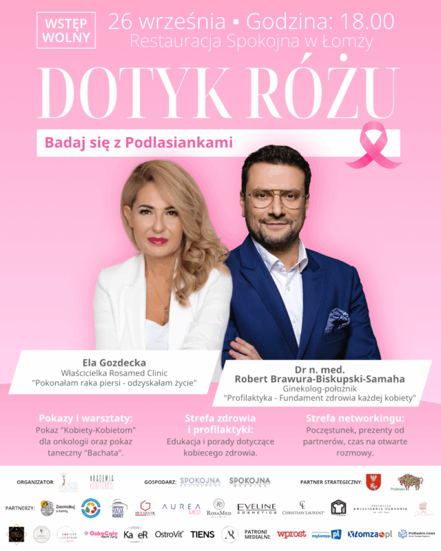 Spotkanie „Dotyk różu” będzie miało charakter otwarty. Skierowane jest to mieszkanek całego województwa podlaskiego choć nie tylko! W programie przewidziane są m.in.: prelekcja wybitnego ginekologa: Dr. Roberta Brawury-Biskupskiego-Samahy, spotkanie z kobietą, która pokonała raka piersi, część edukacyjna poświęcona profilaktyce zdrowotnej, przestrzeń do otwartych rozmów, a także liczne atrakcje towarzyszące. Szczególnym punktem wydarzenia będzie symboliczny „różowy marsz”, w którym udział wezmą laureatki konkursu Miss Polonia Województwa Podlaskiego oraz kobiety 50 plus. Marsz skierowany będzie do kobiet dotkniętych chorobą nowotworową i będzie on wyrazem solidarności i wsparcia dla osób w trakcie leczenia onkologicznego.