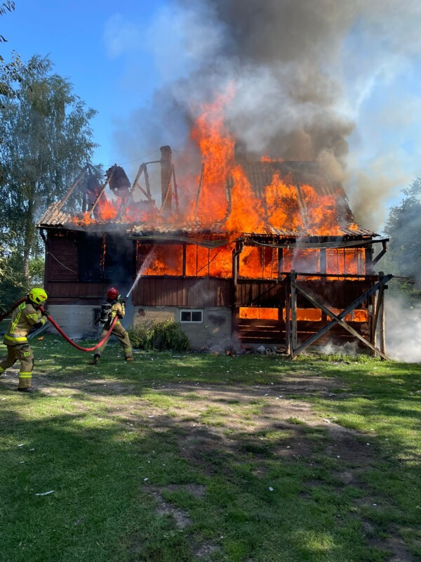 W tym samym czasie doszło do pożaru w miejscowości Topolany. Po przybyciu pierwszego zastępu straży pożarnej zastano drewniany dom z poddaszem całkowicie objętym pożarem. Właścicielka mieszkania zdążyła ewakuować się z budynku razem z dwójką dzieci. Wraz z ze strażakami OSP pożar gaszono łącznie czteroma prądami wody oraz jednym działkiem samochodowym. Budynek przeszukano w celu odnalezienia wcześniej zgłoszonej butli z gazem oraz skrytych zarzewi ognia. Poszkodowani nie wymagali hospitalizacji, a obecna na miejscu zdarzenia przedstawicielka Urzędu Gminy Michałowo przydzieliła im lokal zastępczy.