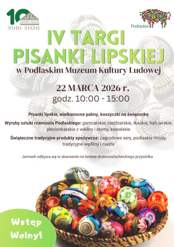 IV Wielkanocne Targi Pisanki Lipskiej w Podlaskim Muzeum Kultury Ludowej! Zapraszamy w niedzielę, 22 marca 2026 r. o godz. 10.00-15.00. Wydarzenie co roku odbywa się dwa tygodnie przed Wielkanocą i jest niepowtarzalną okazją do tradycyjnych świątecznych zakupów, ale też promocją twórców ludowych, przede wszystkim pisankarek z Lipska nad Biebrzą.