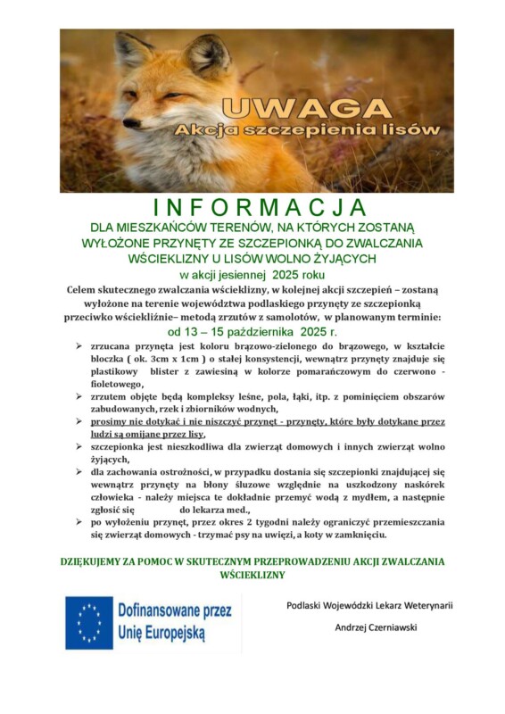 Celem skutecznego zwalczania wścieklizny, w kolejnej akcji szczepień – zostaną wyłożone na terenie województwa podlaskiego przynęty ze szczepionką przeciwko wściekliźnie – metodą zrzutów z samolotów, w planowanym terminie: od 13 do 15 października 2025 r.