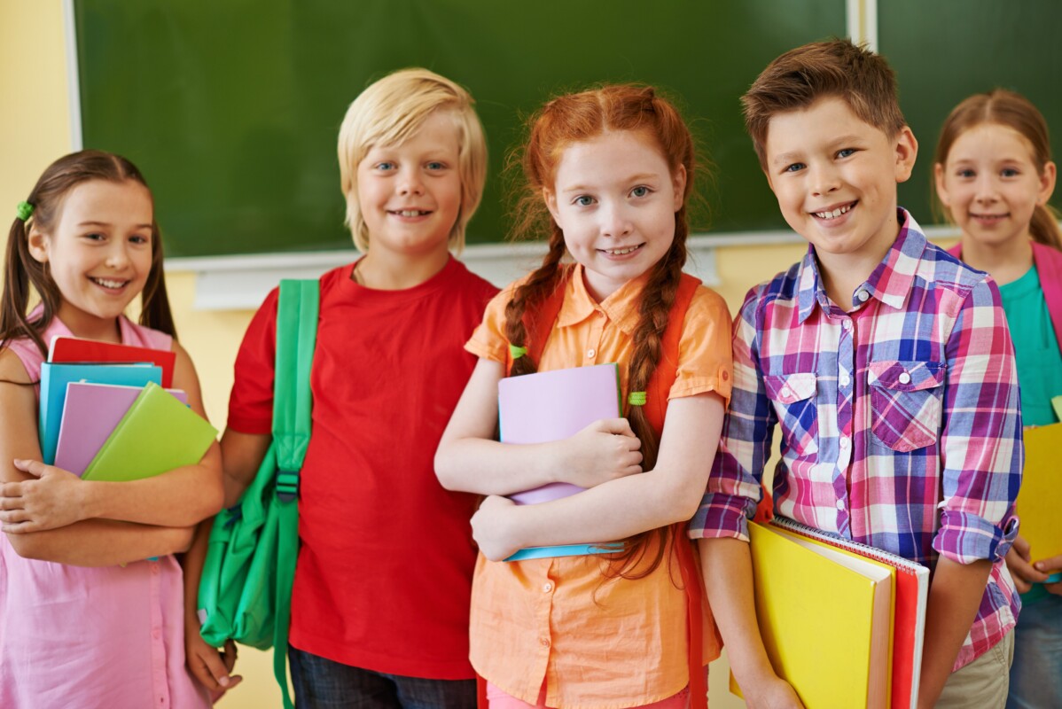 Five friendly classmates looking at camera on background of blackboard