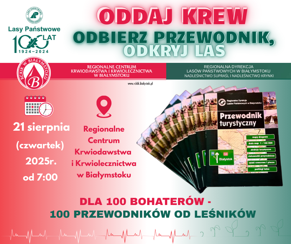 Zapraszamy do wzięcia udziału w kolejnej akcji zorganizowanej w ramach współpracy białostockich leśników z Regionalnym Centrum Krwiodawstwa i Krwiolecznictwa w Białymstoku.Kontynuujemy świętowanie jubileuszu 100-lecia Lasów Państwowych.