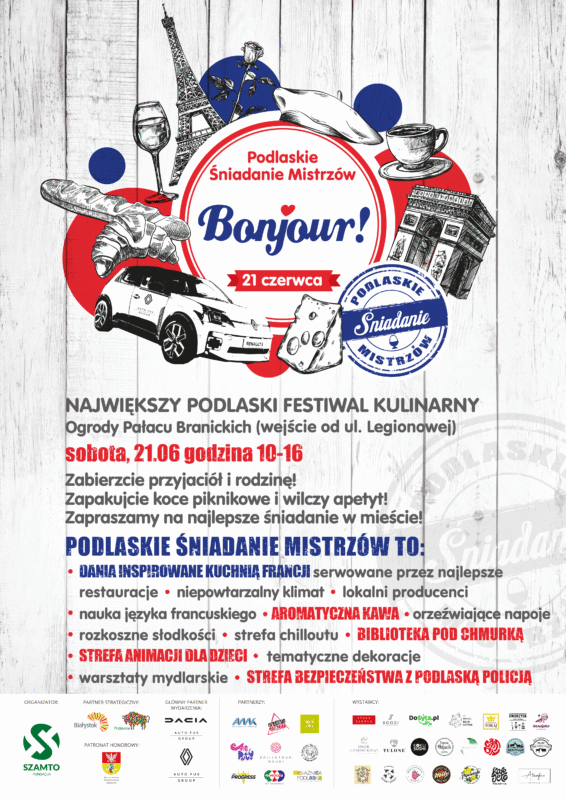 Tym razem wydarzenie odbędzie się pod hasłem „BONJOUR!”. W sobotę (21 czerwca), w godz. 10.00-16.00 można będzie nie tylko miło spędzić czas próbując ciekawych dań. Jak co roku organizatorzy zadbali o masę dodatkowych wrażeń. Nowością będzie strefa Książnicy Podlaskiej, gdzie będzie można wypożyczyć książkę i założyć kartę biblioteczną. W popołudnie z książką i croissantem na kocu w pięknym parku – uczestnicy będą mogli się poczuć jak Francuzi na Champs-Élysées. Kolejna nowość to strefa bezpieczeństwa z Podlaską Policją, która zajmie całą „suchą fosę”. Natomiast po raz kolejny wolontariusze Schroniska dla Zwierząt w Białymstoku przyprowadzą do parku psy gotowe do adopcji.