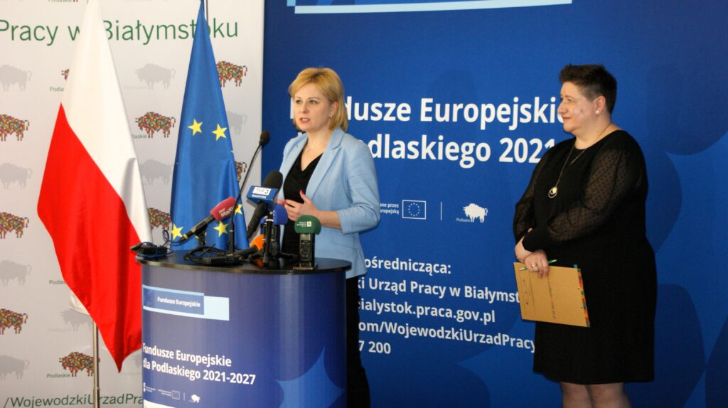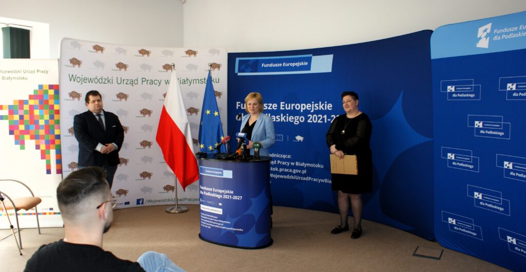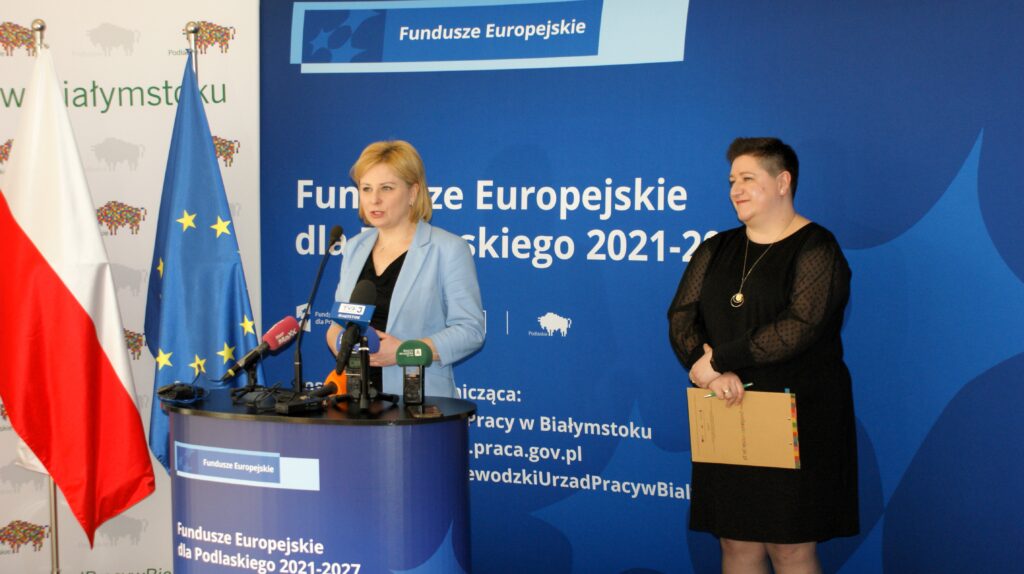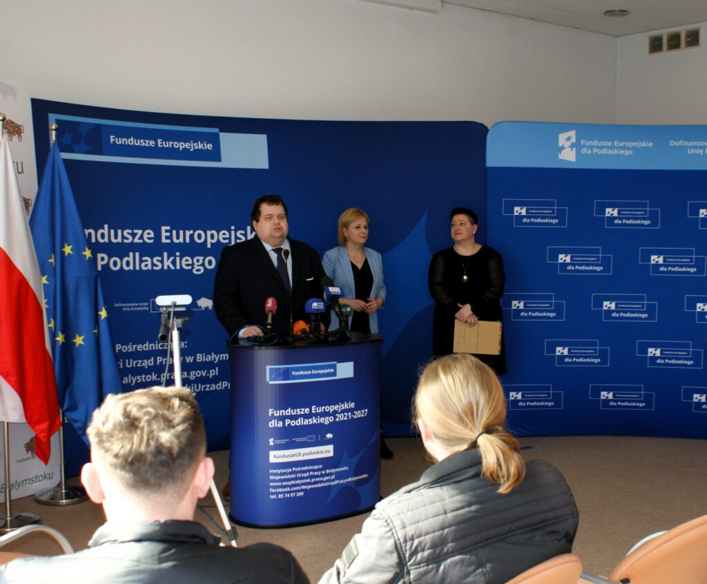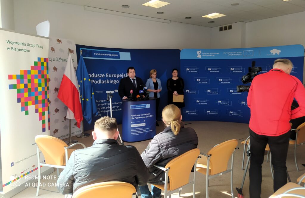 W Wojewódzkim Urzędzie Pracy w Białymstoku odbył się briefing prasowy poświęcony projektowi pn.: „Podmiotowy System Finansowania – realizacja usług rozwojowych w województwie podlaskim” w ramach Programu Fundusze Europejskie dla Podlaskiego 2021-2027. Joanna Sarosiek – dyrektor Departamentu Rozwoju Regionalnego Urzędu Marszałkowskiego Województwa Podlaskiego w Białymstoku zaznaczyła, że będzie on realizowany do końca grudnia 2029 r. Dofinansowanie ze środków unijnych (z Europejskiego Funduszu Społecznego Plus) wynosi prawie 55 mln złotych, czyli o przeszło 4 mln zł więcej niż przeznaczono na tego typu działanie w poprzedniej perspektywie. Wynika to z decyzji podjętej przez dr Artura Kosickiego – Marszałka Województwa Podlaskiego.