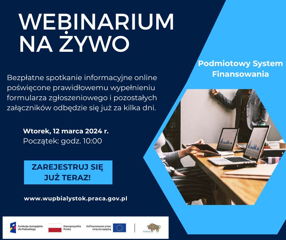 Przypominamy też, że już jutro (12 marca 2024 r.) o godz. 10:00 rozpocznie się ostatnie webinarium w formule on-line poświęcone zasadom przygotowywania dokumentacji w przedmiotowym naborze (w załączeniu plansza promocyjna). Będzie ono transmitowane na oficjalnym profilu naszej instytucji w mediach społecznościowych: facebook.com/WojewodzkiUrzadPracywBialymstoku