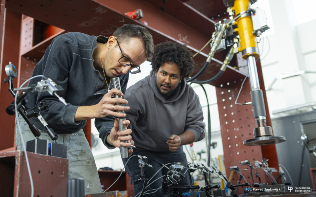 W nauce niezastąpione są kontakty mistrz-uczeń, stąd liczni doktoranci zajmujący się tematyką badań rozpoczętą przed dekadą w Katedrze Konstrukcji Budowlanych i Mechaniki Budowli na Wydziale Budownictwa i Nauk o Środowisku Politechniki Białostockiej. Abel Belay z Etiopii swoje badania prowadzi pod kierownictwem prof. Kosior-Kazberuk. Przy maszynie wytrzymałościowej krząta się też mgr inż. Rafał Kostro.