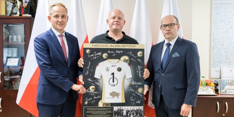 Necko Augustów to jeden z kilku siatkarskich klubów z naszego regionu wspieranych przez Samorząd Województwa Podlaskiego. Podczas środowego (02.08) spotkania za pomoc w rozwoju drużyny podziękował prezes Karol Kamiński wręczając marszałkowi Arturowi Kosickiemu oraz radnemu wojewódzkiemu Pawłowi Wnukowskiemu pamiątkowy grawerton.