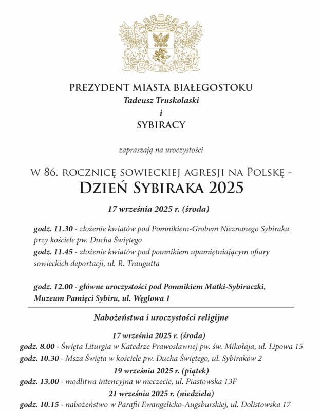 Obchody 86. rocznicy sowieckiej napaści na Polskę rozpoczną się 17 września o godz. 8.00 od nabożeństwa w intencji ofiar w Katedrze Prawosławnej pw. Św. Mikołaja przy ul. Lipowej 15. Nabożeństwa odbędą się także w Parafii Ewangelicko-Augsburskiej przy ul. Dolistowskiej 17 (godz. 10.15) oraz w kościele pw. Ducha Świętego przy ul. Sybiraków 2 (godz. 10.30). W meczecie przy ul. Piastowskiej 13F o godz. 13.00 będzie miała miejsce modlitwa intencyjna.