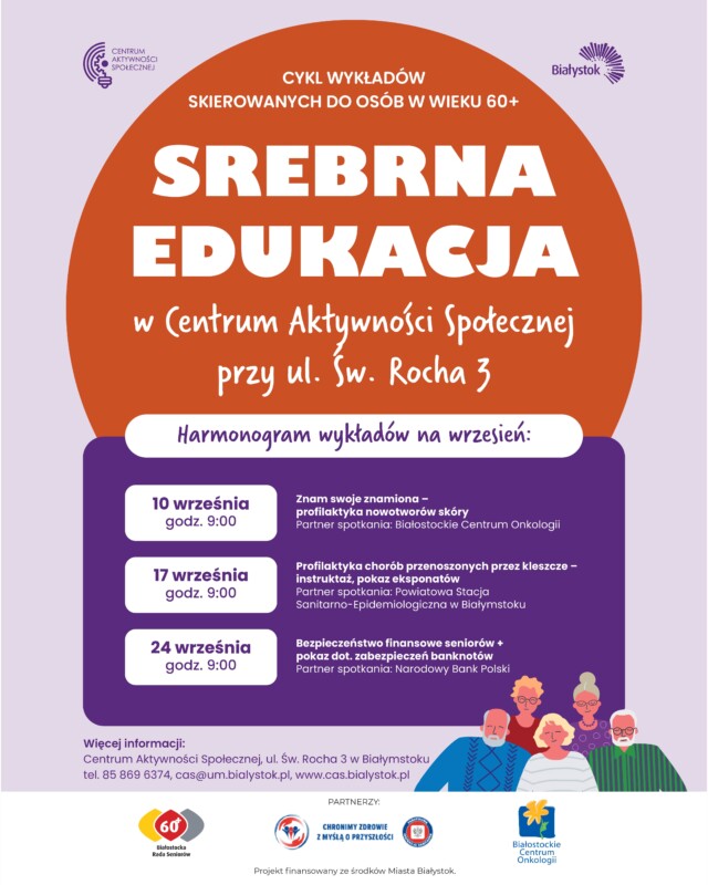 Harmonogram na każdy miesiąc będzie na bieżąco opracowywany i udostępniany przez CAS. Informacje będą dostępne pod nr tel. 85 869 63 74 oraz na www.cas.bialystok.pl. Jeszcze w tym miesiącu – 17 września odbędzie się prelekcja o profilaktyce chorób przenoszonych przez kleszcze, natomiast 24 września będzie mowa o bezpieczeństwie finansowym seniorów – odbędzie się pokaz dotyczący zabezpieczenia banknotów.