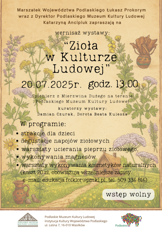 „Zioła w kulturze ludowej”, czyli nowa wystawa stała w Podlaskim Muzeum Kultury Ludowej. Zapraszamy na otwarcie! Niedziela, 20 lipca, godz. 13.00, zagroda z Dąbrowy Moczydeł. Ekspozycja została zaaranżowana w zabytkowym spichlerzu z Mierzwina Dużego. W trakcie wernisażu przed spichlerzem odbywać się będą warsztaty robienia maceratów ziołowych, wykonywania kosmetyków naturalnych, pogadanka o zbieraniu ziół i oraz degustacja napojów ziołowych.Liczba miejsc na warsztatach jest ograniczona, dlatego obowiązują zapisy (edukacja.folklor@pmkl.pl; 509 336 816). Zapisywać się można do piątku 18 lipca, do godz. 14.00. Cena: 20 zł/os.